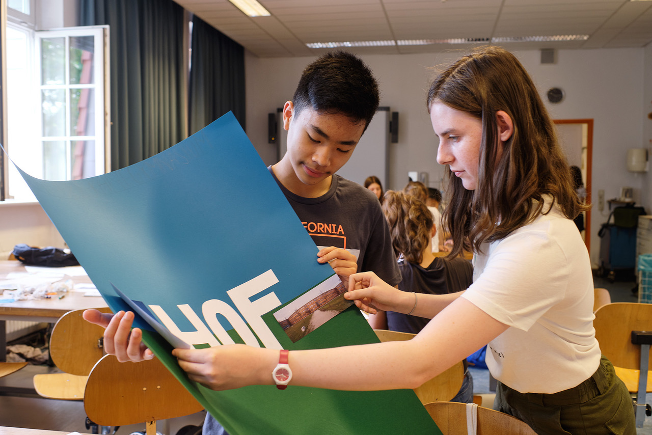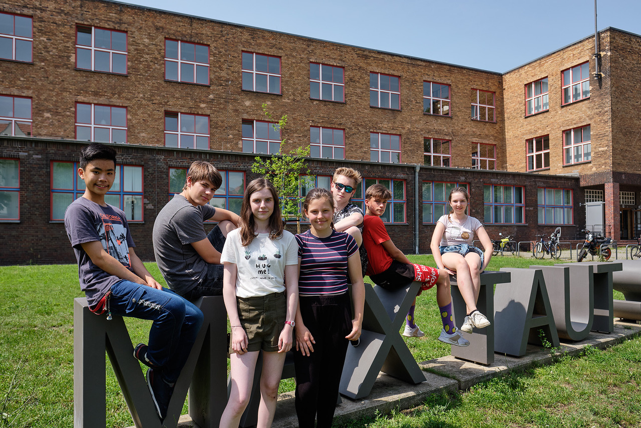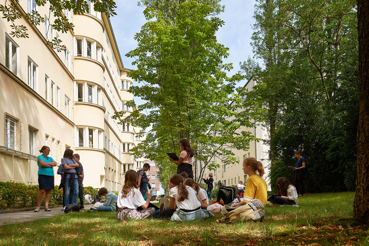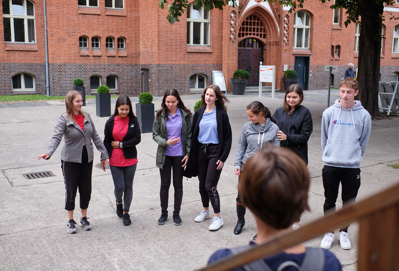 Schülerinnen und Schüler vom Wahlpflichtkurs Kunst der 8. Klasse des Immanuel-Kant-Gymnasiums erkundeten die in unmittelbarer Nähe gelegene und von Max-Taut gebaute Schule. Nach dem Erkunden der eigenen Schule, einem Bau mit Kunststeinverkleidungen von 1906, wurden beide Schulen verglichen und die Unterschiede festgehalten.