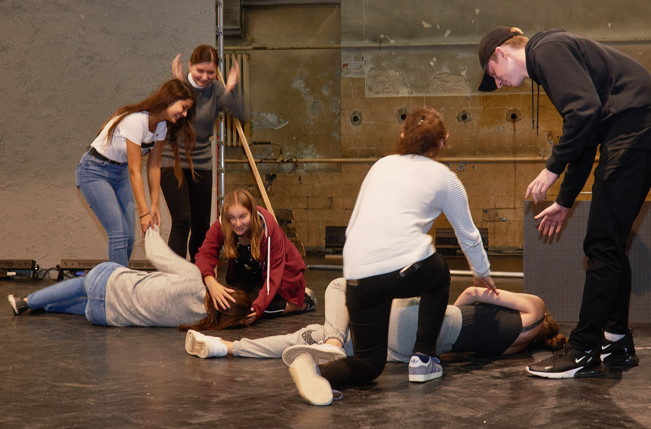 Schülerinnen und Schüler vom Wahlpflichtkurs Darstellendes Spiel der 11. Klasse des Johann-Gottfried-Herder-Gymnasiums Friedrichshain gingen – basierend auf dem Umgestaltungsprozess von einer ehemaligen Turnhalle in eine Theaterspielstätte – der Frage nach, welchen Transformationen ein Denkmal im Wandel der Zeit unterliegt.