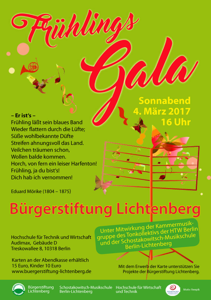 Am Sonnabend, 4. März 2017 um 16 Uhr findet die Frühlingsgala der Bürgerstiftung Lichtenberg statt.